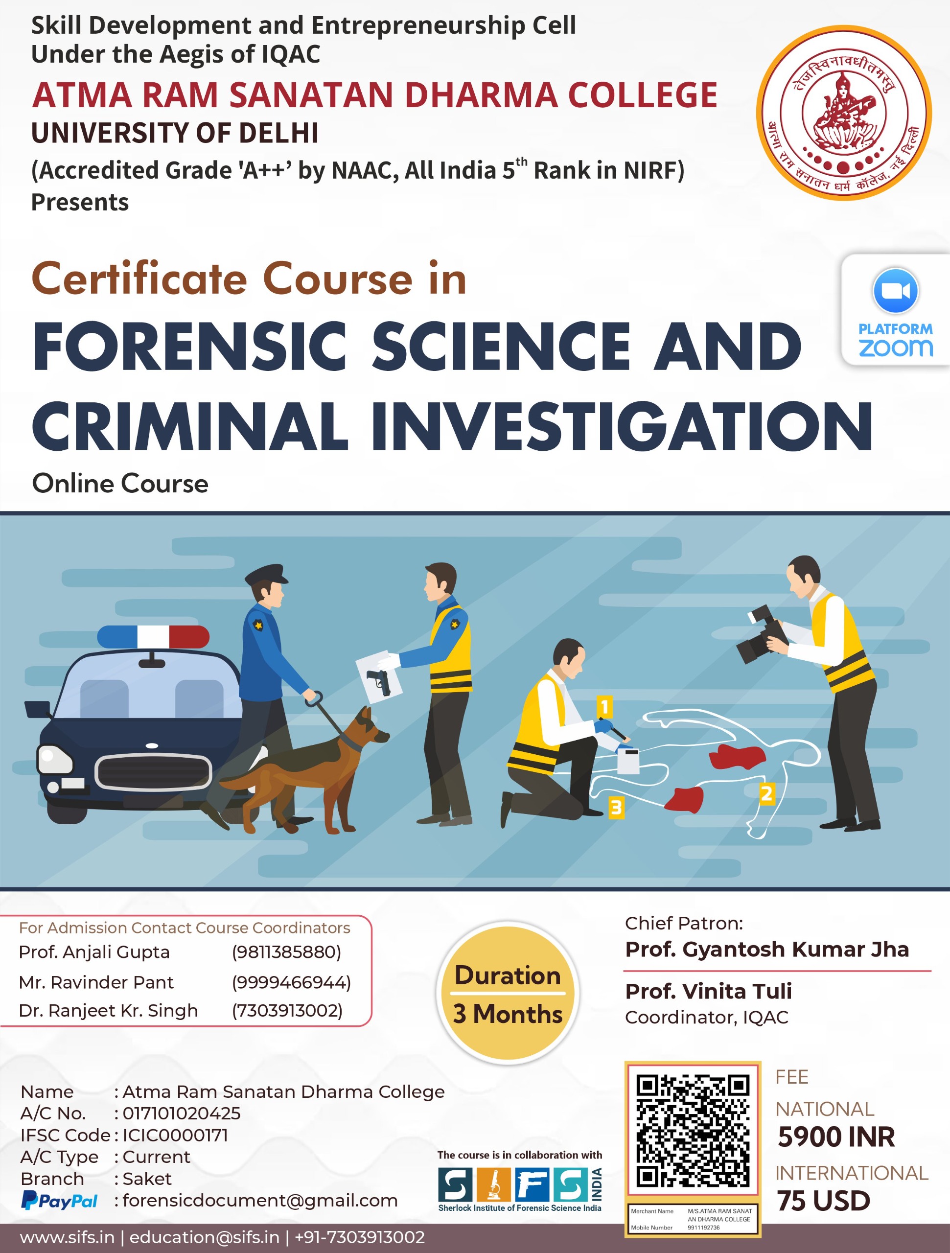 Atma Ram Sanatan Dharma College, University of Delhi, in collaboration with Sherlock Institute of Forensic Science India, is excited to announce our 6th Batch of the Add-on Certificate Course in Forensic Science and Criminal Investigation.This course is designed to provide participants with essential skills in forensic science, crime scene investigation, and criminal justice procedures. It is ideal for students, law professionals, and anyone interested in understanding the intersection of science and law enforcement.