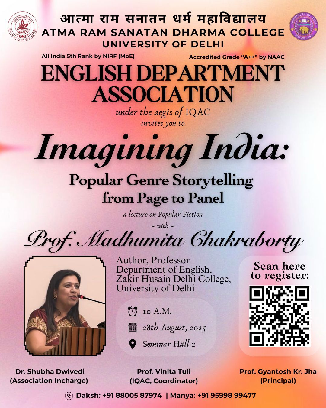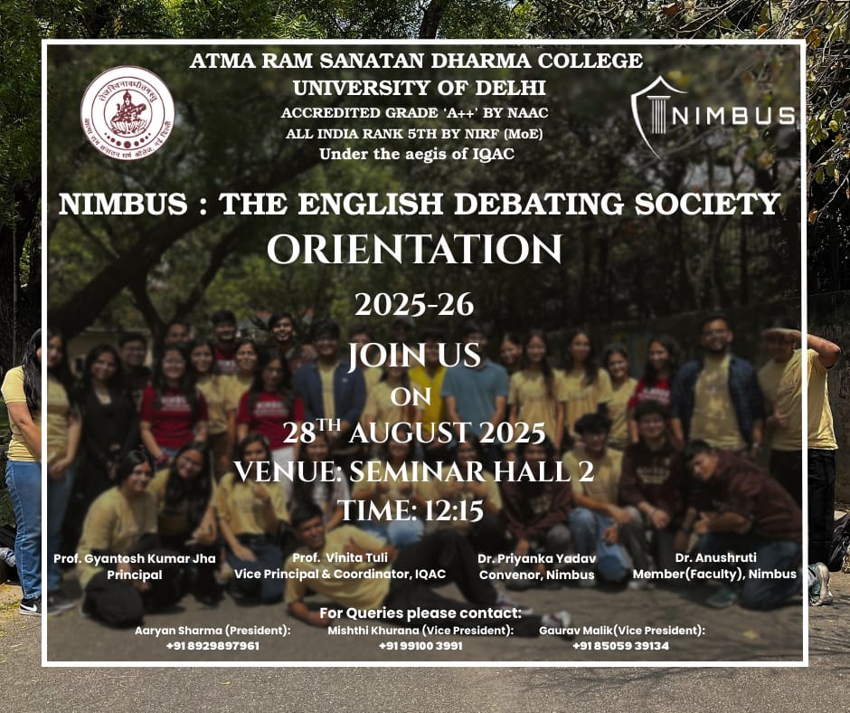 Seminar Hall 1Dhirah in collaboration with World University Service(WUS)-DUC, STAR DBT College Scheme and *HOPE ( Mental Health & Well Being Society)* launches its Session on Mind Your Mind Dhirah – The Spiritual Society of ARSD – proudly presents its Orientation featuring the one and only HG Amogh Lila Prabhuji 🎙️ 🌟 Youth icon & monk loved […]
